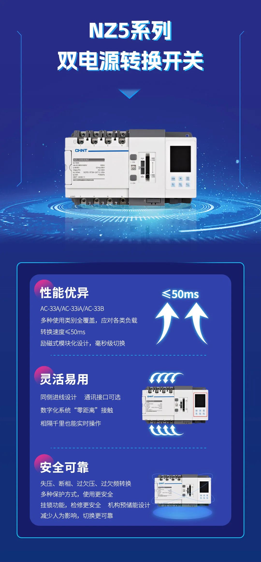 正泰NM5TS系列电子式塑壳断路器适用于交流50/60Hz,额定电压AC690V及以下,额定电流16A至1000A电路中。作为接通、分断和承载额定电流,能在线路和用电设备发生过载、短路、欠压的情况下对线路和用电设备进行可靠的保护,也能作为电动机的不频繁起动及过载、短路、欠压保护。产品具有安全可靠、灵活易用、智慧物联等特点,可广泛应用于5G&通信行业的配电应用场景。