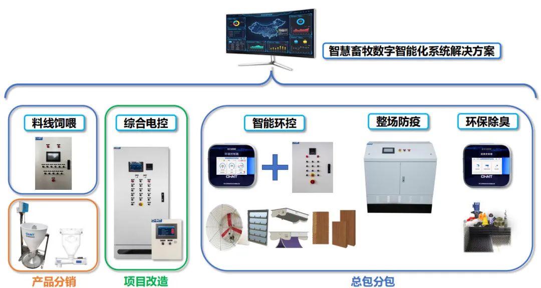 正泰自动化科技现有七大业务方案,分别是智能环控、畜禽监管、整场防疫、综合电控、整场能效、整场料线和可配套搭载的智慧数字化方案。
