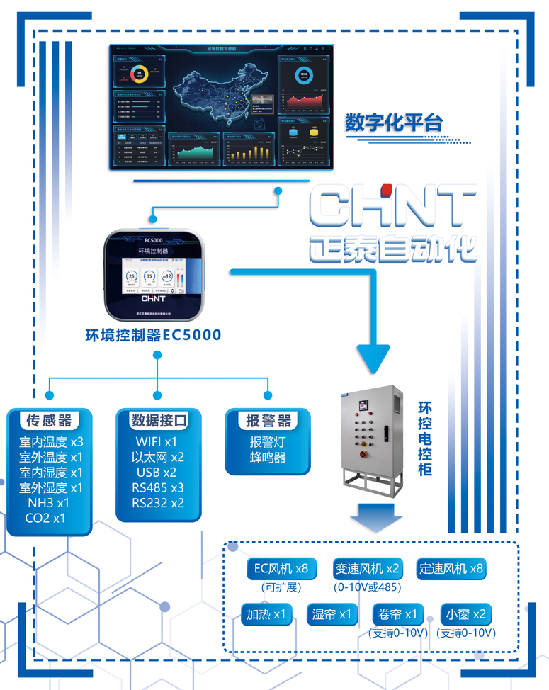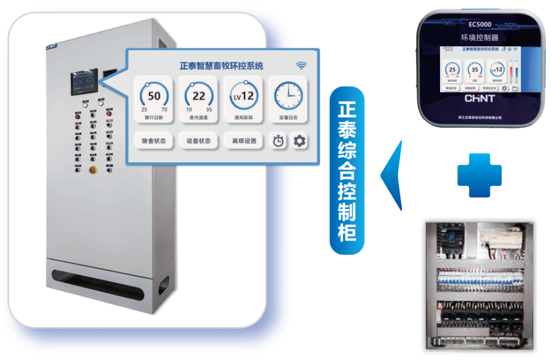 正泰自动化科技智能环控方案以环境控制器和环控电控柜为核心,搭载数字化平台,实现对猪舍环境的最佳控制和实时监管,提高猪只的生产性能。