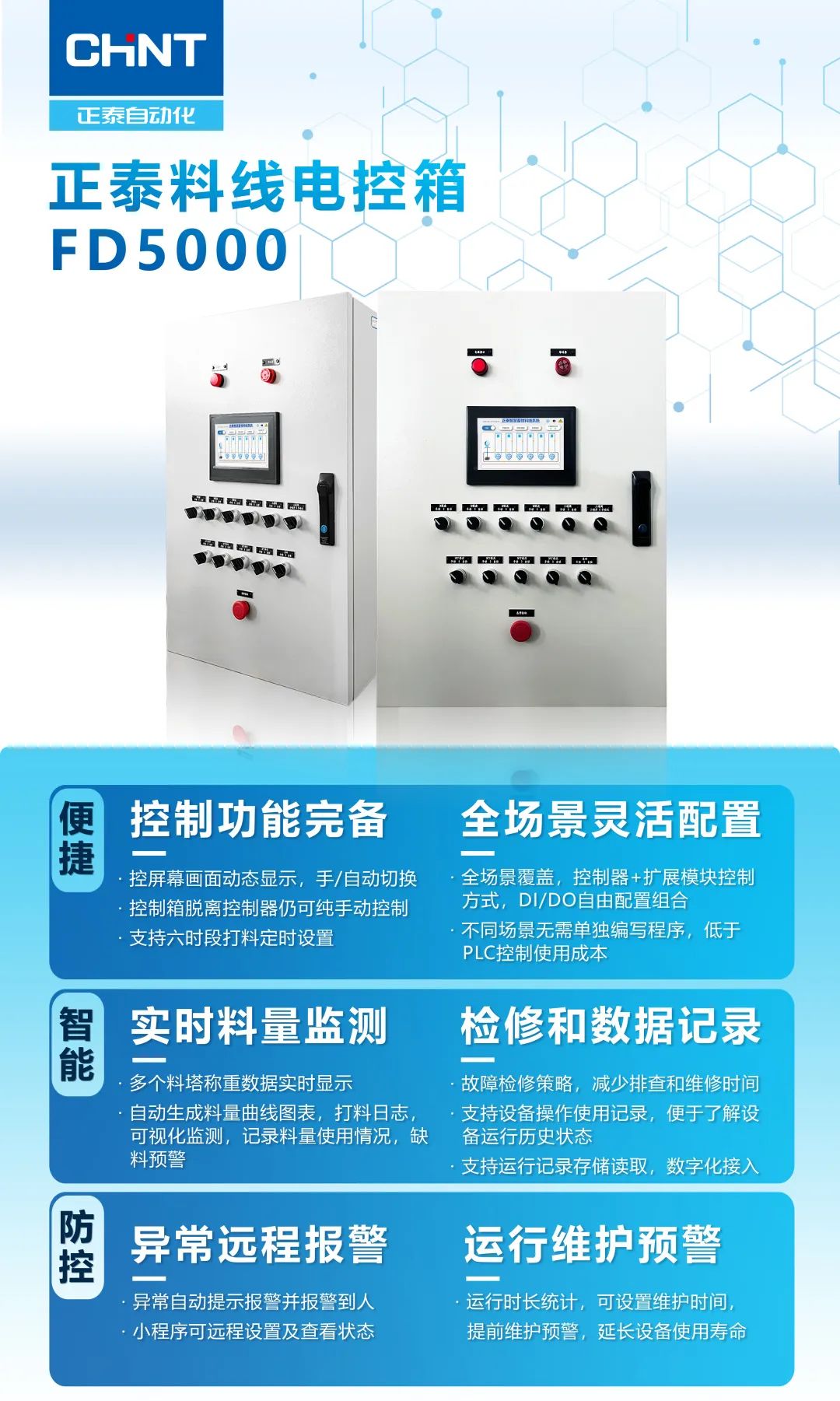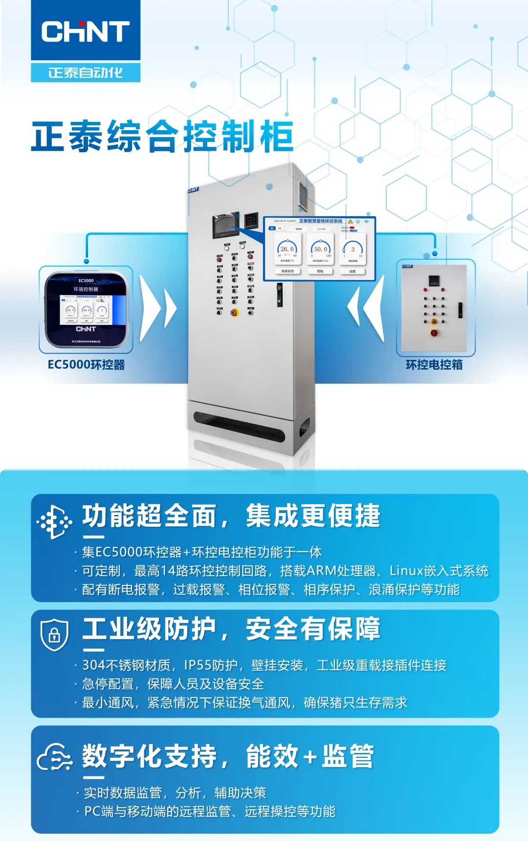 正泰自动化科技的综合控制柜性能稳定,结合正泰强大的电气专业背景,安全保护功能齐全、报警提示极速到人、可配备相应应急预案,最大程度上降低事故风险,避免造成经济损失。