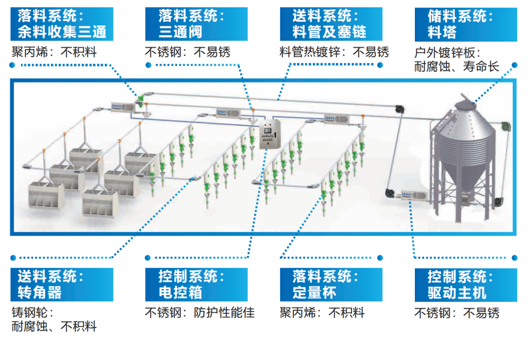 送料系统:分为绞龙料线和塞盘料线,可通过料管将干料运送至猪场内不同的位置;