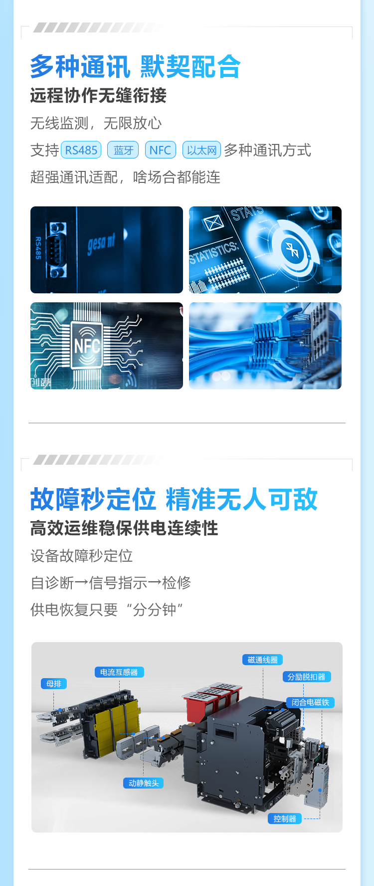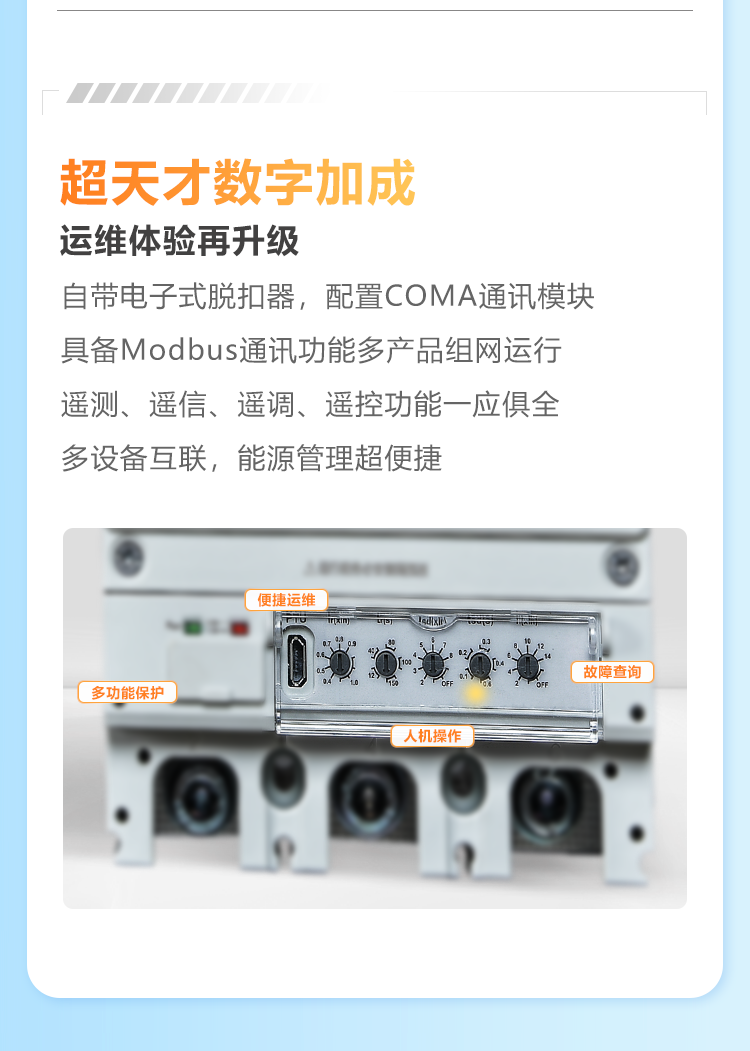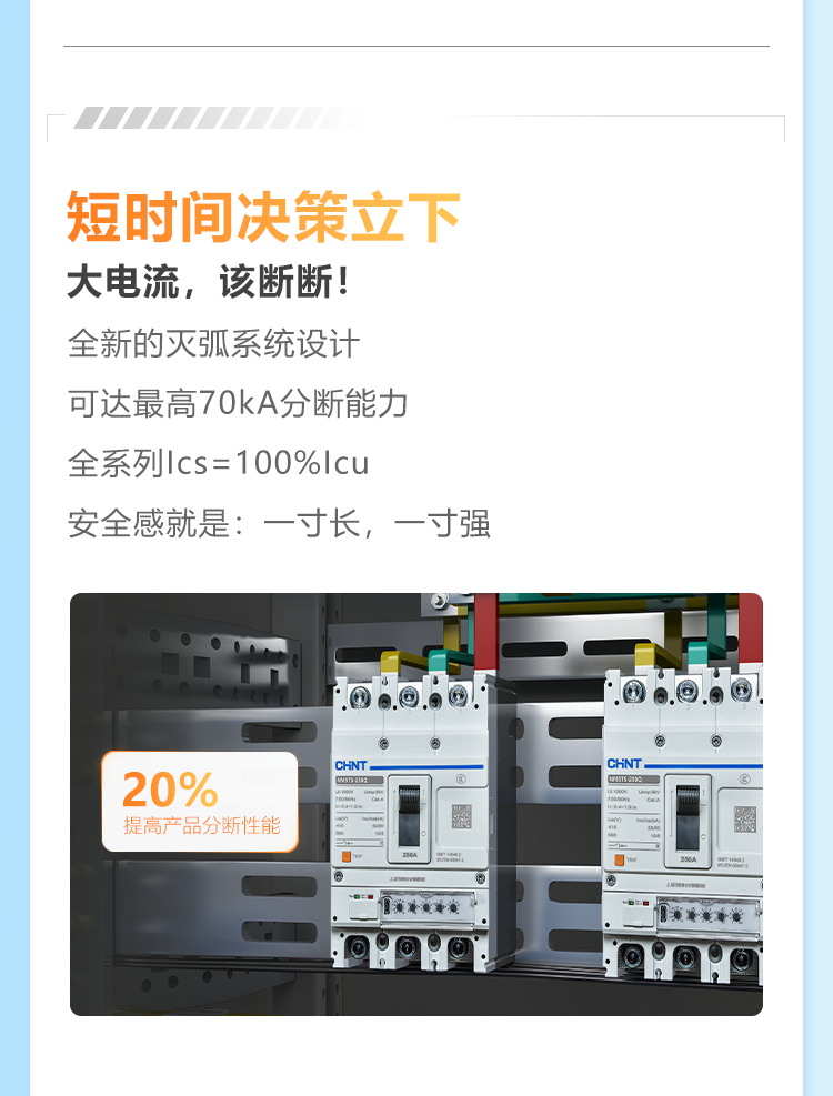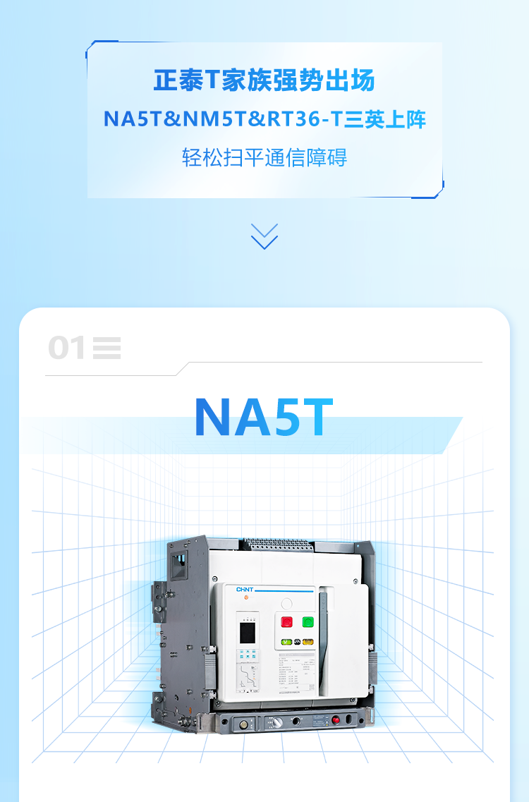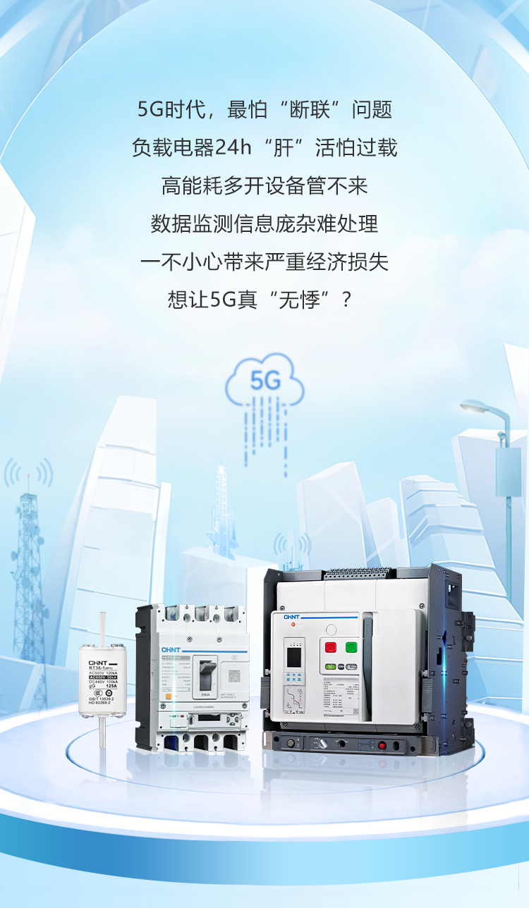 正泰NM5TS系列电子式塑壳断路器适用于交流50/60Hz,额定电压AC690V及以下,额定电流16A至1000A电路中。作为接通、分断和承载额定电流,能在线路和用电设备发生过载、短路、欠压的情况下对线路和用电设备进行可靠的保护,也能作为电动机的不频繁起动及过载、短路、欠压保护。产品具有安全可靠、灵活易用、智慧物联等特点,可广泛应用于5G&通信行业的配电应用场景。